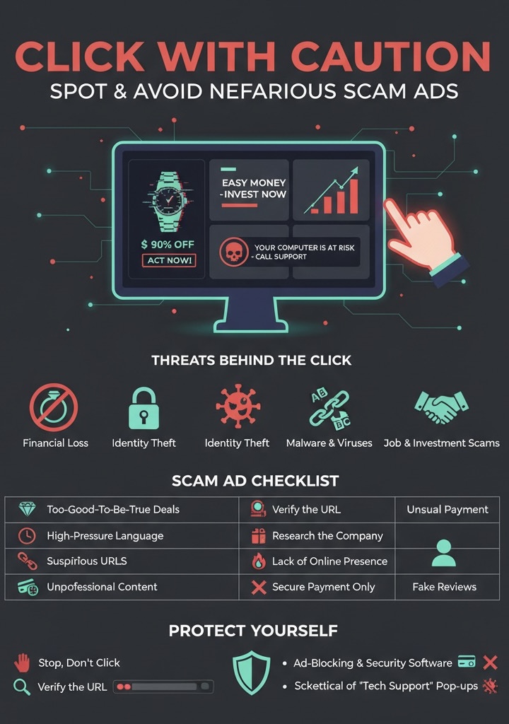 In today’s digital world, online advertisements are everywhere—on social media feeds, search results, and websites. While most are from legitimate businesses, a growing number are designed by cybercriminals to steal your money, personal information, or even infect your device. These are the nefarious scam ads, and being able to identify them is a crucial skill for safe browsing.